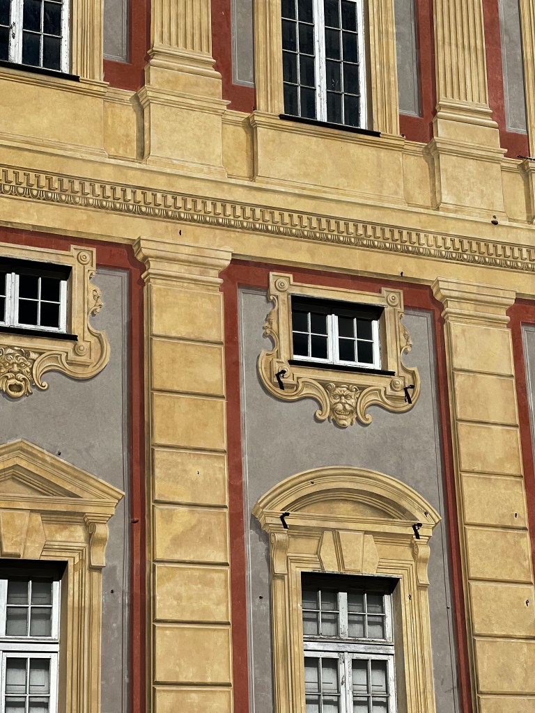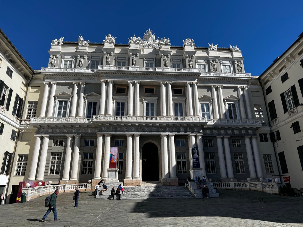 Well it’s a beautiful morning here in Genova. The sky is blue and the sun warm. I thought this post could be about the palaces of the nobility in the Genoese republic. This is a UNESCO World Heritage Site and there seems to be a lot of renovation. In the sunshine the architecture really stands out. Renaissance and Baroque buildings everywhere though they’re hard to photograph as the Main Street is very narrow and the buildings are cheek by jowl, crowding each other out for the best space and vying for external decorative flair. I love it here … edgy and not too self conscious. Tromp l’oeil effects decorate the walls.