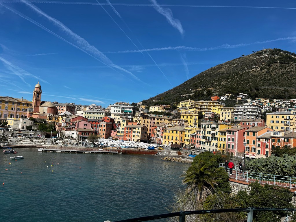 Just 15 minutes by train from the centre of Genoa is Nervi. Today it looks fabulous. No tourists so I’m sitting writing this in a cafe by the sea. It’s a pretty little town and I’m practicing my Italian where I can. For €1.50 what a bargain on the train! I think I may be settling in to this.