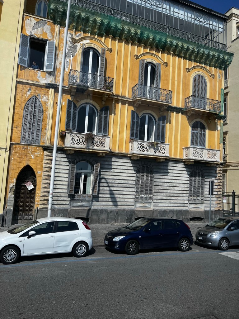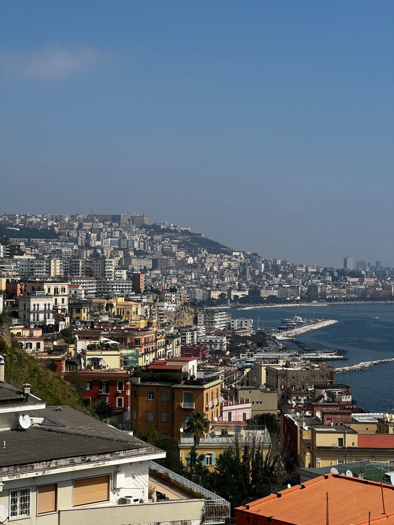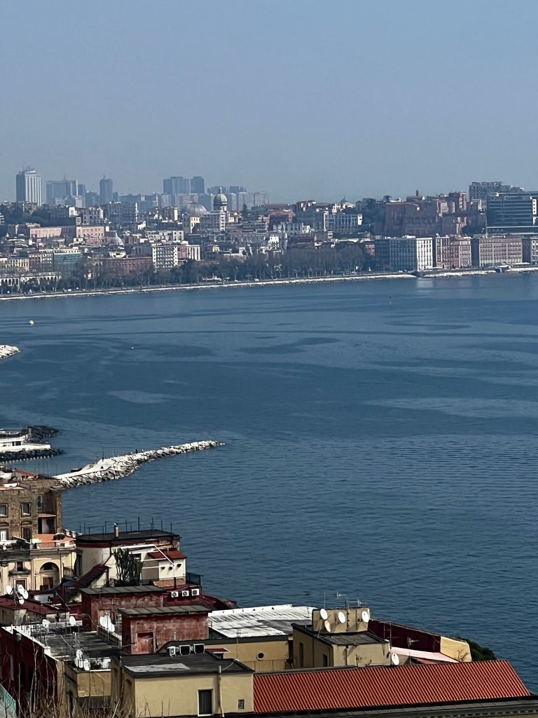 Well it was a four and a half hour trip. It could have been much less if we hadn’t dropped people off in Naples and taken an hour to get through the city. It’s a strange place and driving through the suburbs and centre didn’t inspire me very much. A trip through the docks was, I suppose, serendipity but not the sort I expected. However a stop to view the Bay of Naples with a very misty Vesuvius was pleasant enough. It was rather beautiful.