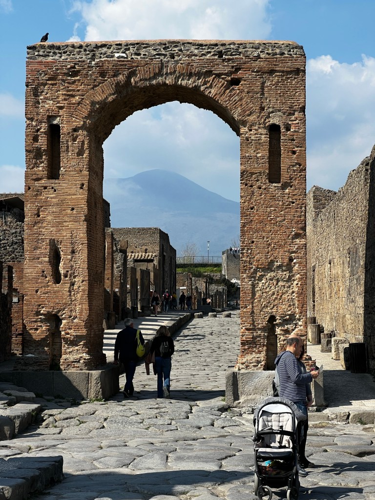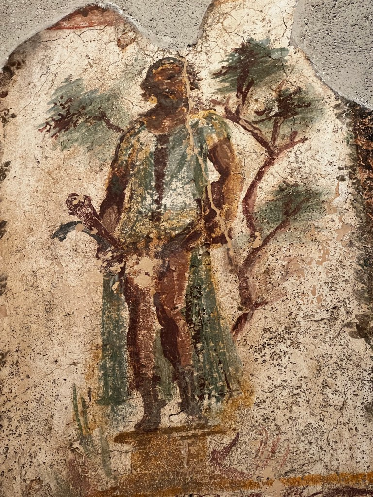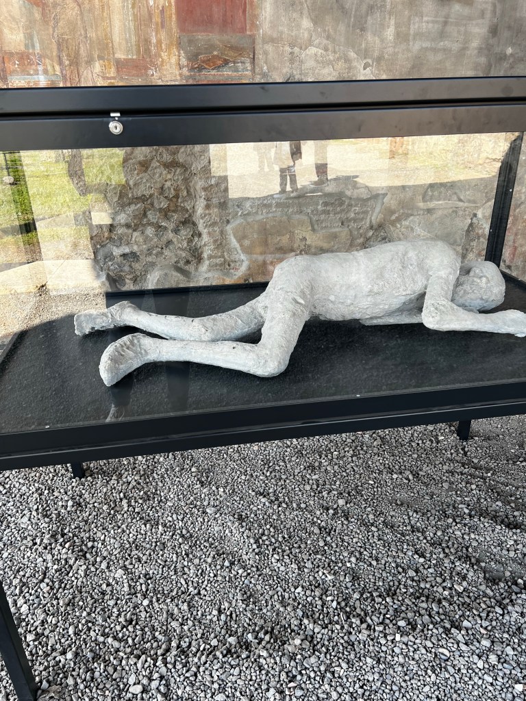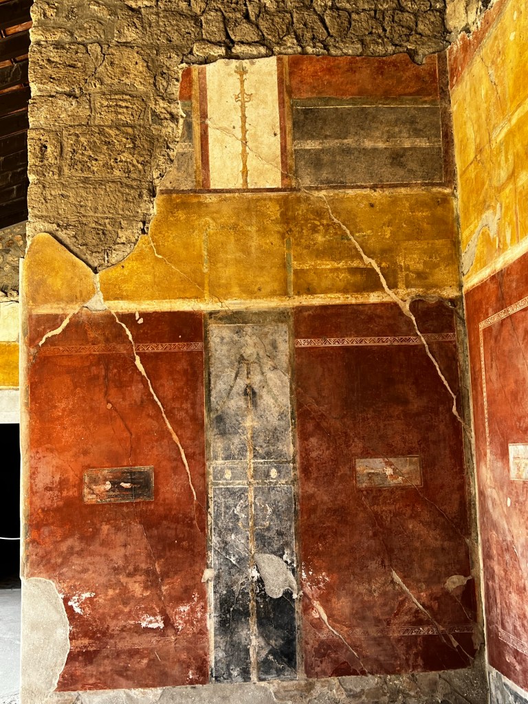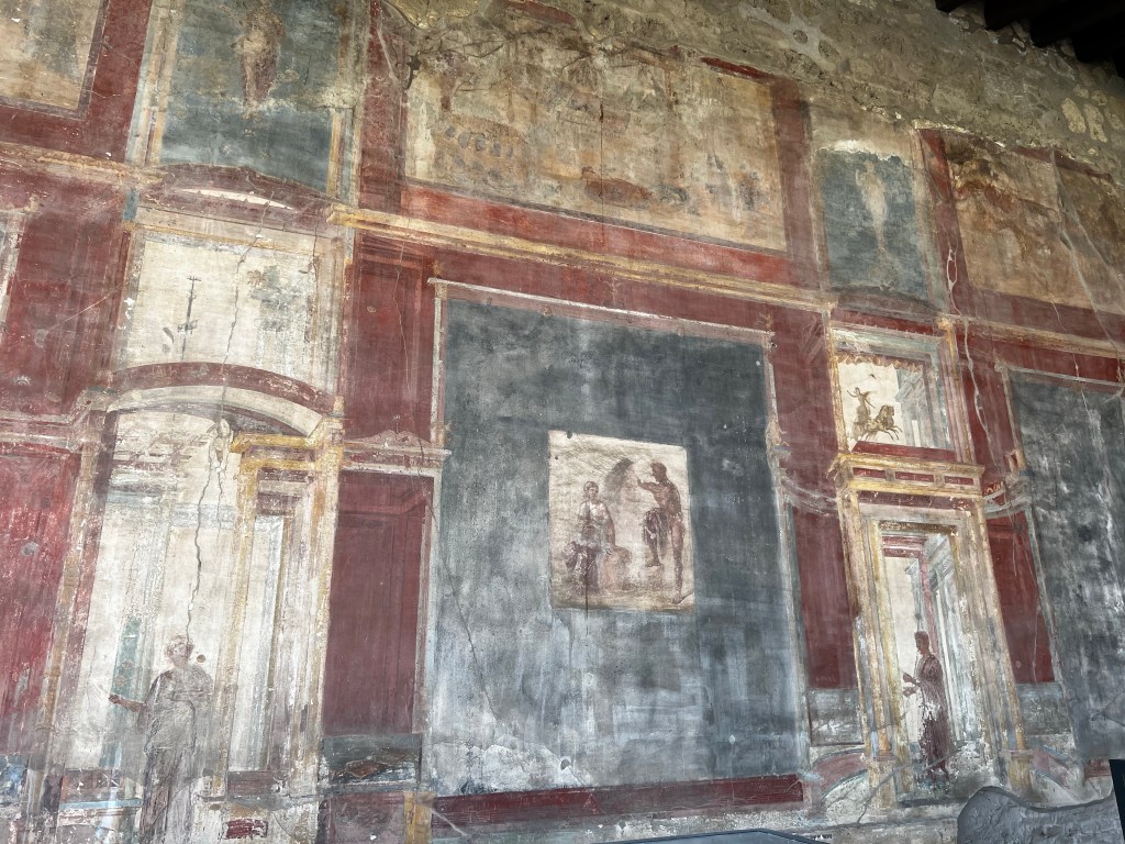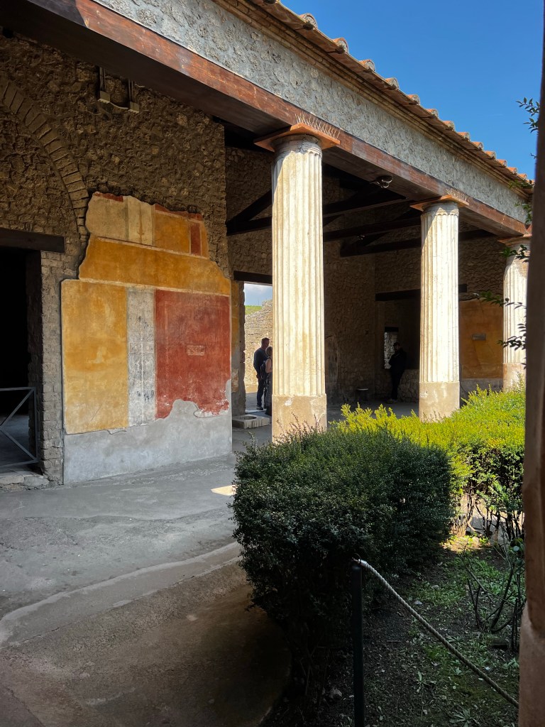 Arriving at Pompeii I was left to my own devices to wander and look around. It’s a great place. I hired an audio guide and had about three hours looking at the many houses and shops that were in the stone street. I saw the House of the Tragic poet with the Cave Canem mosaic. I was especially impressed with the well preserved Casa Della venere in conchiglia with its columns and beautiful frescos. What remains is a shadow of how the house must have looked in its prime. A great insight into the hustle and energy of an ancient city