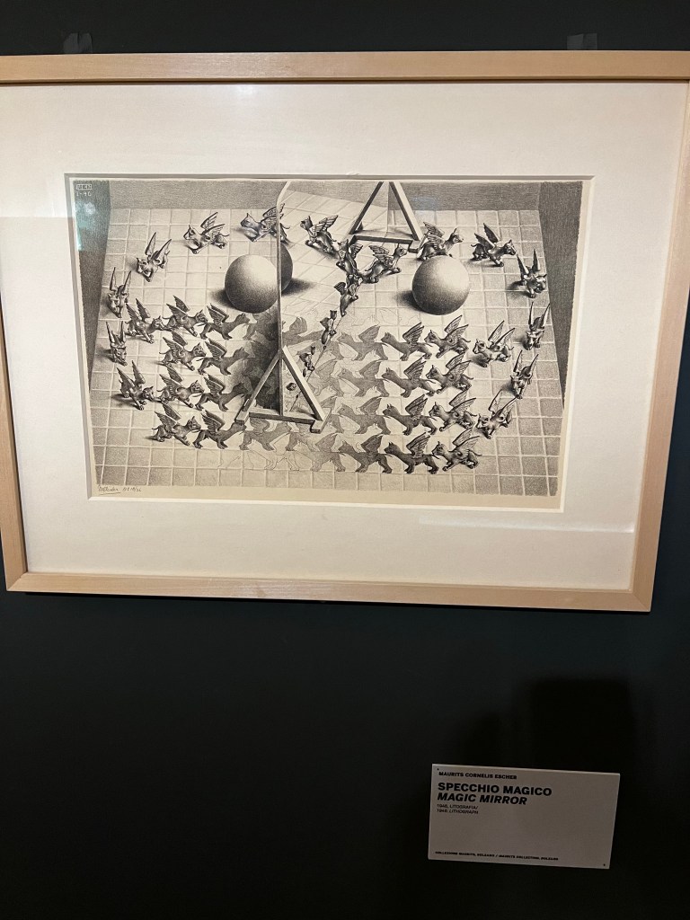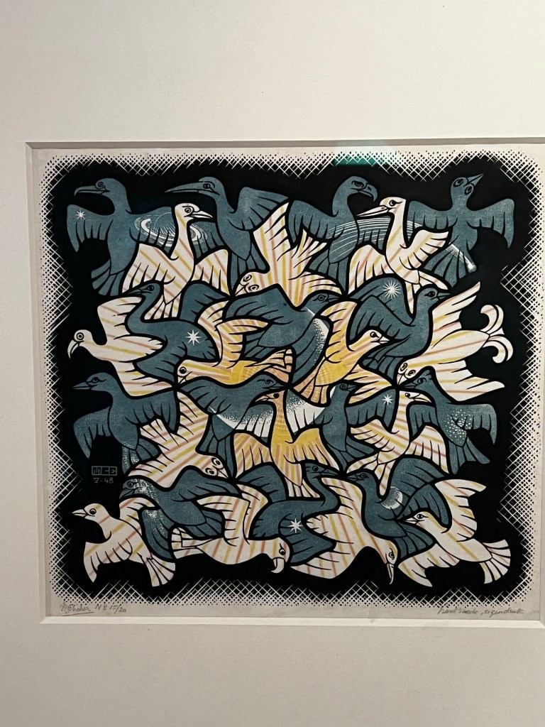 True to form I found an exhibition! Escher is fascinating and what a great draughtsman. His inventiveness and wonderful precision is hypnotic. The first video is of a mirrored room … disorienting and infinite. A remarkable way to show his tessellations