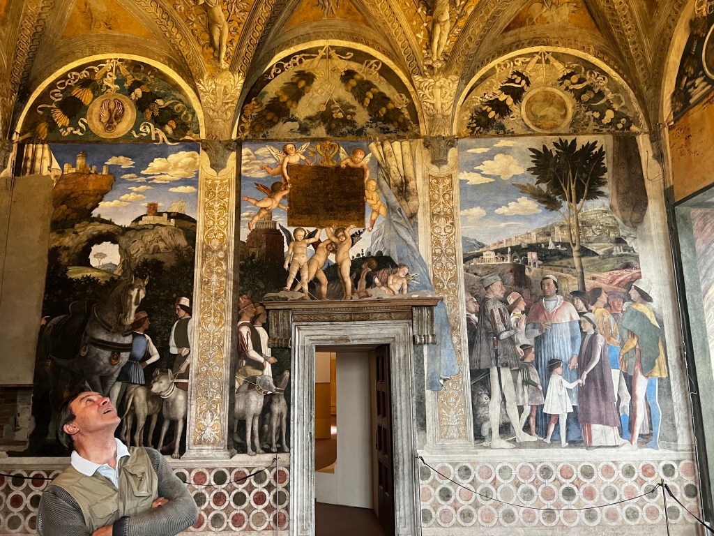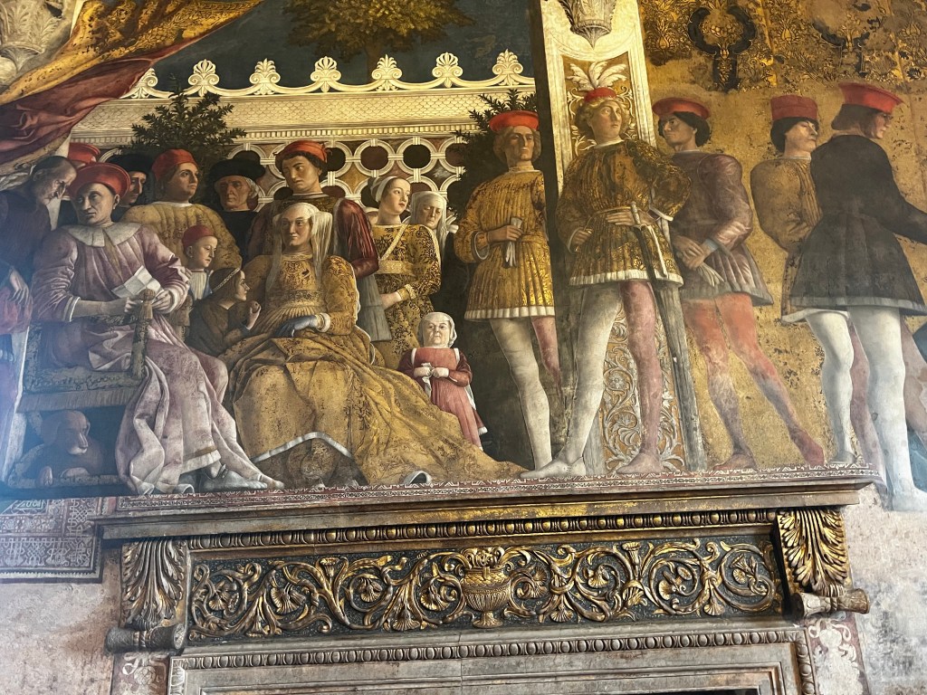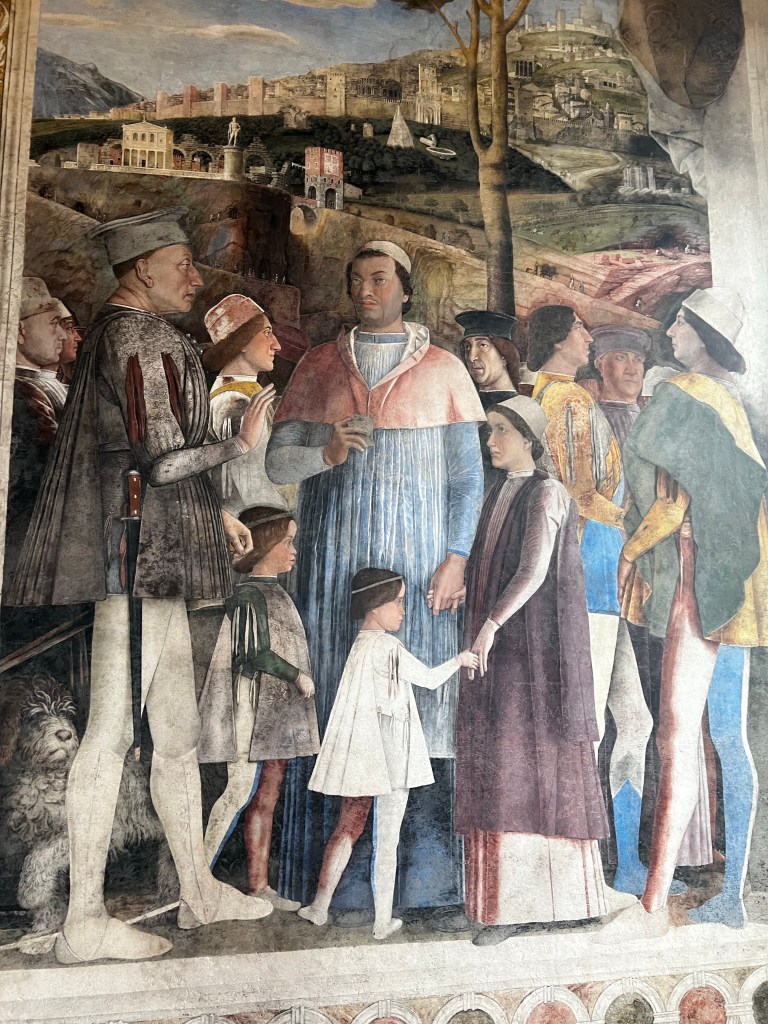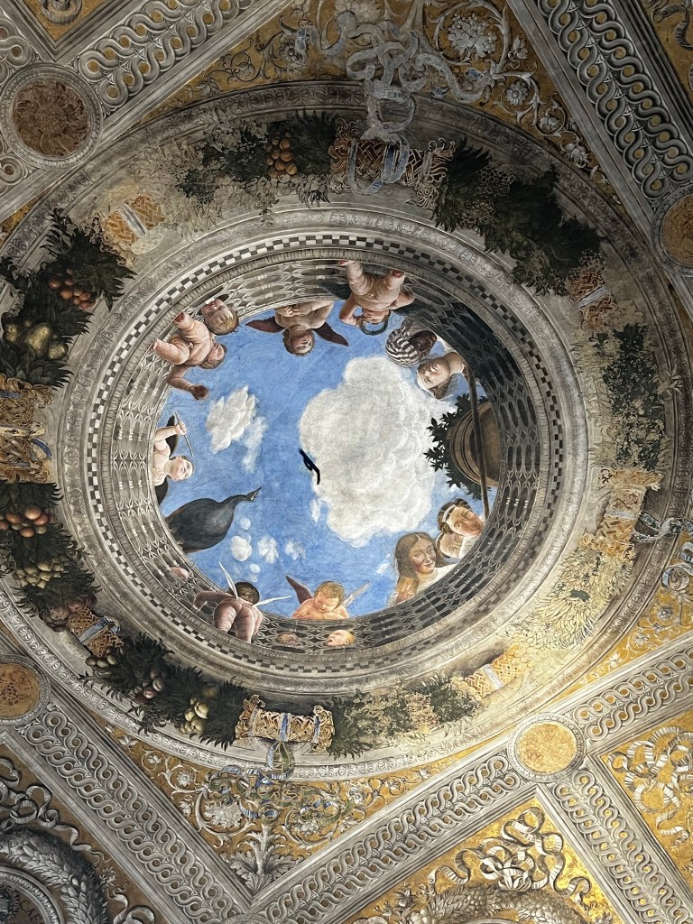 The Palace is remarkable. It is a huge space with so many rooms and galleries. It is a testament to the wealth, power and pride of the Gonzaga family who ruled here. The frescos by Mantegna in La Camera degli Sposi are absolutely wonderful. Painted into wet plaster they seem fresh as the day the were executed in the 1460s. They are a marvel of trompe l’oeil … deceiving the eye. The central ceiling panel of angels leaning over a parapet is in a foreshortened technique called “di sotto in Su” … from below upwards. The realism is amazing … you feel as if these people could step into your life … such immediacy and vigour. The way landscape is revealed is magical. The sky so blue … the distance so inviting. These are real people.