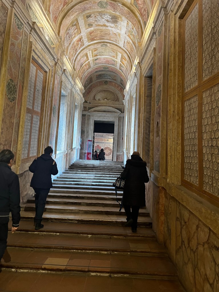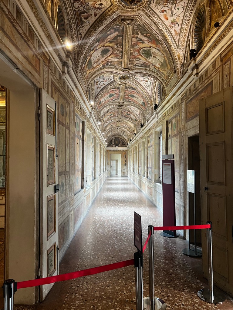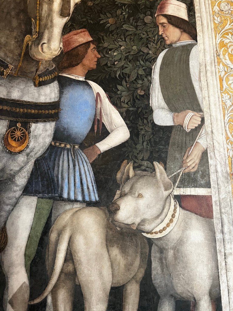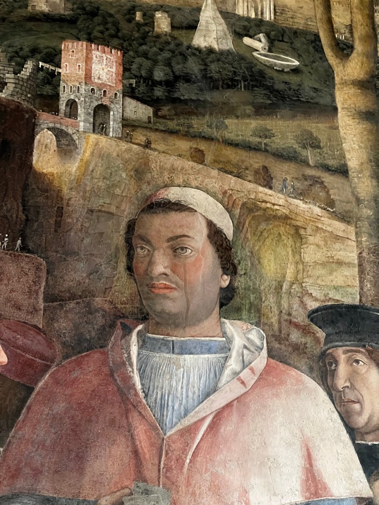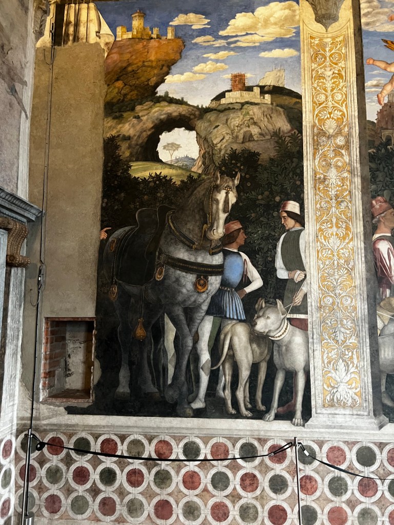 The Palace is remarkable. It is a huge space with so many rooms and galleries. It is a testament to the wealth, power and pride of the Gonzaga family who ruled here. The frescos by Mantegna in La Camera degli Sposi are absolutely wonderful. Painted into wet plaster they seem fresh as the day the were executed in the 1460s. They are a marvel of trompe l’oeil … deceiving the eye. The central ceiling panel of angels leaning over a parapet is in a foreshortened technique called “di sotto in Su” … from below upwards. The realism is amazing … you feel as if these people could step into your life … such immediacy and vigour. The way landscape is revealed is magical. The sky so blue … the distance so inviting. These are real people.