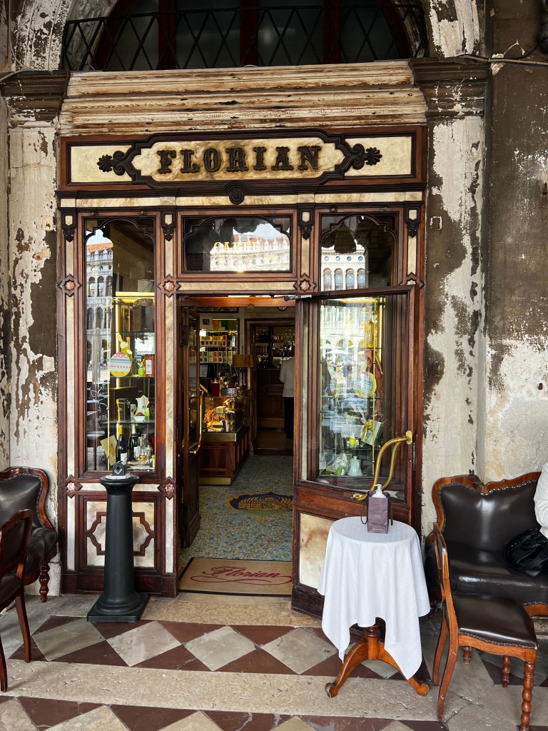 I’m sitting in Florian’s in St Marks Square as I write. A piece of Vienna in Venice. Rather beautiful inside but of course it’s now a tourist attraction resting on the myth of turn of the century bourgeois experience. But the coffee is good even if it costs an arm, a leg and a head. But I thought why not. Coffee in St Marks is part of the experience. I’m surrounded by a party of fashionably dressed Japanese ladies drinking hot chocolate with cream and taking selfies. Perhaps this is the twentieth century equivalent of nineteenth century Austrian bourgeois matrons. Venice makes the most of the Belle Epoque idea with a string quartet playing waltzes in one of the cafes. I sit wondering what visitors think … do they embrace this pastiche wholeheartedly or smile as the faintly ridiculous situation. It’s a little preposterous… but maybe a little enjoyable too.