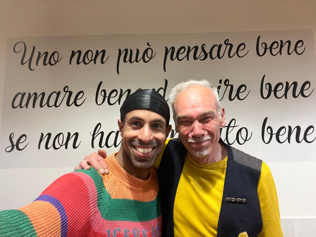 After wandering a bit we ended up walking the backstreets of Genoa … I saw my first prostitutes … in a dark alley, very medieval. They were all I expected them to be … make up, shoes, skirts! Obviously as gay men we weren’t approached! Then back to the hostel for a drink. It’s a great city here with some fabulous shops and great graffiti. Some of the passages I told you about were rather intimidating after dark but going in twos made it feel possible… and there were a couple of real surprises to be found there! It was interesting to hear Cedric’s take on gay life and culture in Italy … Genoa has very little… although it’s perfectly legal it still seems very closeted and secret. Meetings are by apps and people are reluctant to host in their own homes … because of gossip!