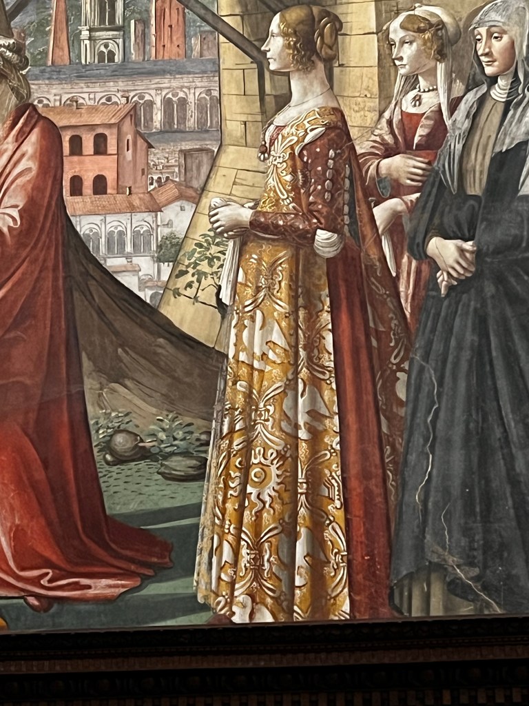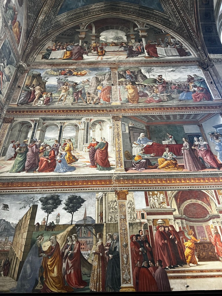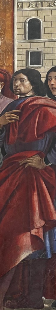 This was a rather wonderful chapel decorated by Ghirlandaio in the 1470s. Wonderfully realists works in which the artist depicted the family and friends of the rich Tornabuoni family as participants in bible stories. It reminded me of the conversational pictures in the Camera degli Sposi in Mantua. Ghirlandaio depicted himself in The work … an arrogant gesture from a self confident artist. In all spectacular.