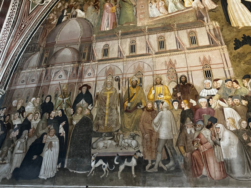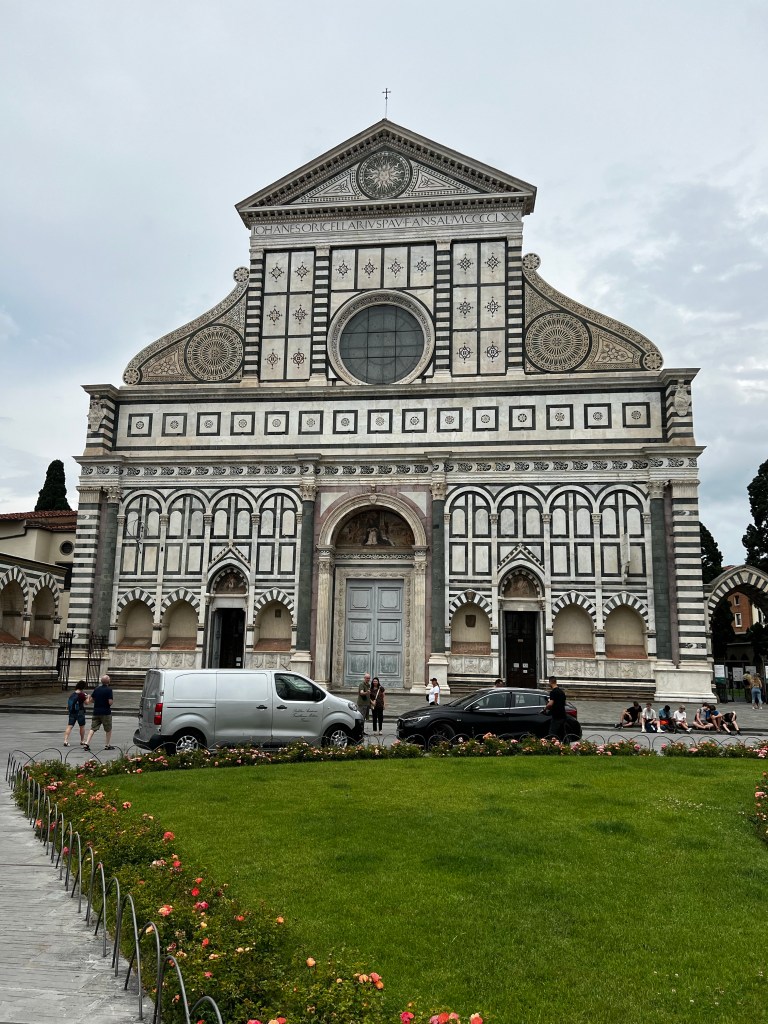 This afternoon our tour with the lovely Maurizio took us to the 13th century church of Santa Maria Novella. Not necessarily beautiful architecturally though it was interesting. A large church it’s principal interest lay in the wonderful frescoes in the Tornabuoni chapel by Ghirlandaio from the late 15th century and those earlier frescoes in another side chapel. There was also a wonderful set of medieval work in the monks community room. The church was a Dominican foundation serving as a pilgrims hospital relating to st James. Maurizio gave an interesting insight into the economic, commercial and cultural role of Florence at this period and its influence on art.
