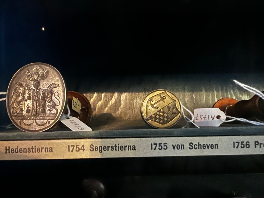 As this is my last morning I was pleased to get into the Riddarhuset. Built in the 1660s it’s a beautiful building in baroque style and housed the nobility and acted as a proto-Parliament until the 19th century. The main assembly chamber walls are lined with the shields of the nobility and there is a fabulous collection of seals of the nobles entitled to attend.