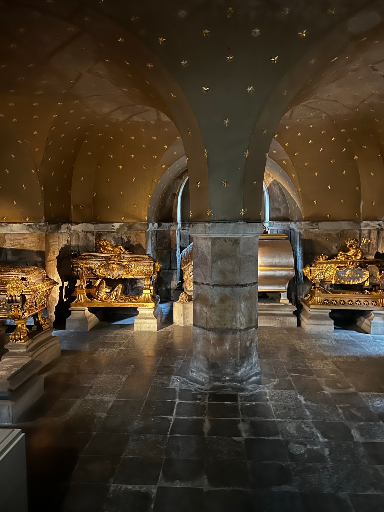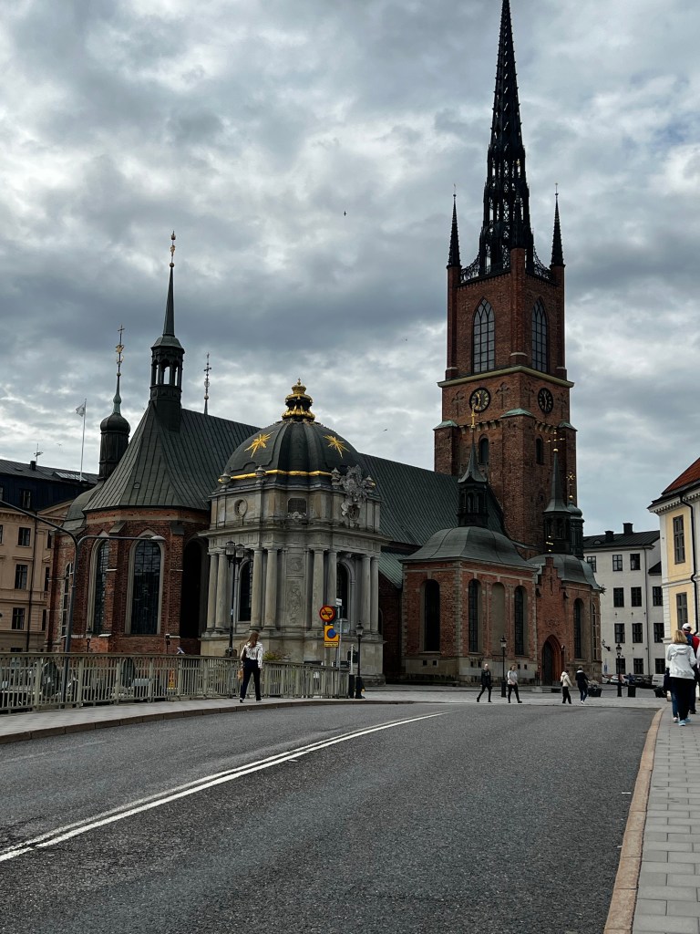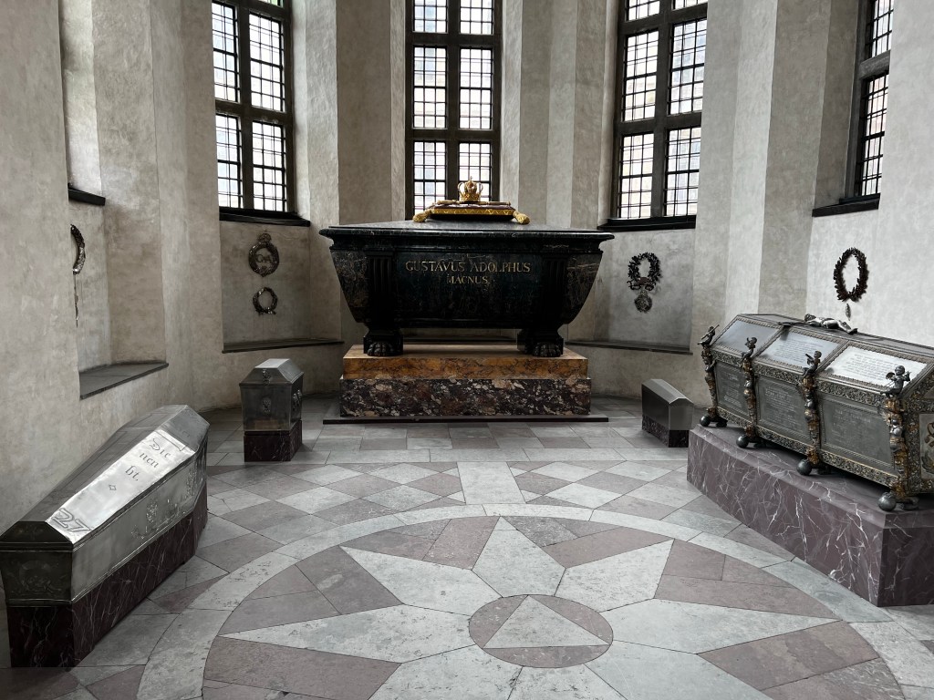 A rather beautiful and austere medieval church it is the royal mortuary church of the Swedish Royal family with some rather interesting tombs. Originally a monastic foundation. The bodies lie in rather beautiful coffins and the Caroline chapel has a vault with some exquisite pewter coffins. The earliest burial is thirteenth century. Each dynasty had its own chapel. It’s also the church of Sweden’s highest order of chivalry and the church is lined with the shields of members.