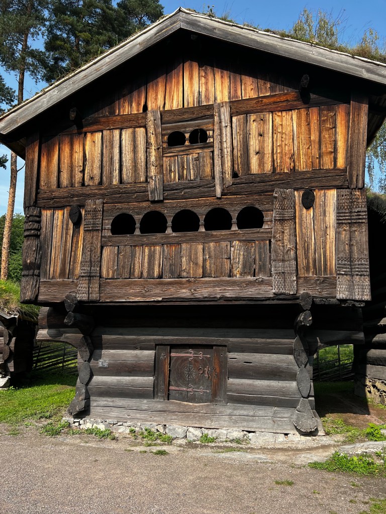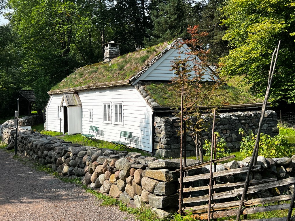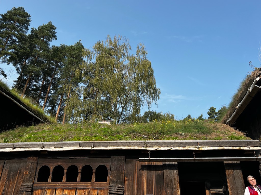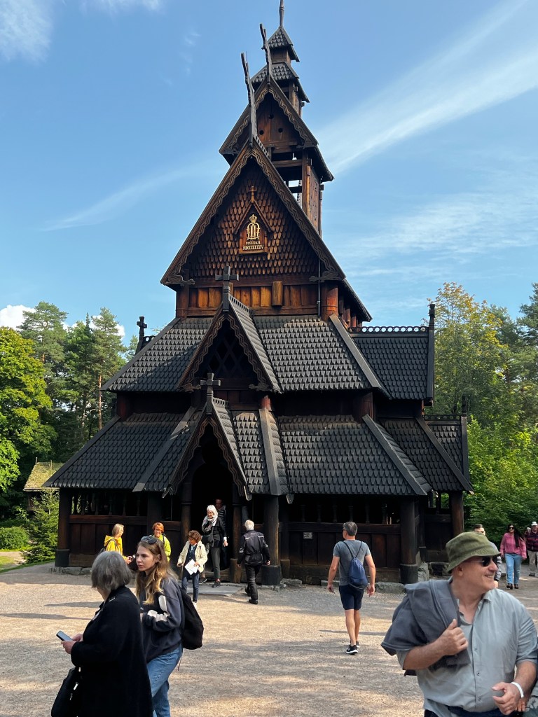 This was a great day out and the weather was beautiful today; a ferry trip to the museum and a wander around this enlightening space. Founded in the 1890s it’s sim is to display Norwegian culture and heritage through buildings and objects. It is a little like our Weald Museum in Sussex and it contains buildings that have been rescued from different areas of Norway and rebuilt on this site. The earliest buildings are from the 1300s and give a real insight into the way of life which continued until the 19th century. An excellent guide gave us a wealth of historical information on agriculture and living conditions. The centrepiece was the Stave Church erected here in the 1880s. It is dated by dendrochronology ti about 1280 and is quite magnificent. The reconstruction here must have been very difficult at that time. The interior has been stripped back to its original state. A masterpiece of the carpenters art. Beautiful carvings and a surprising early mural.