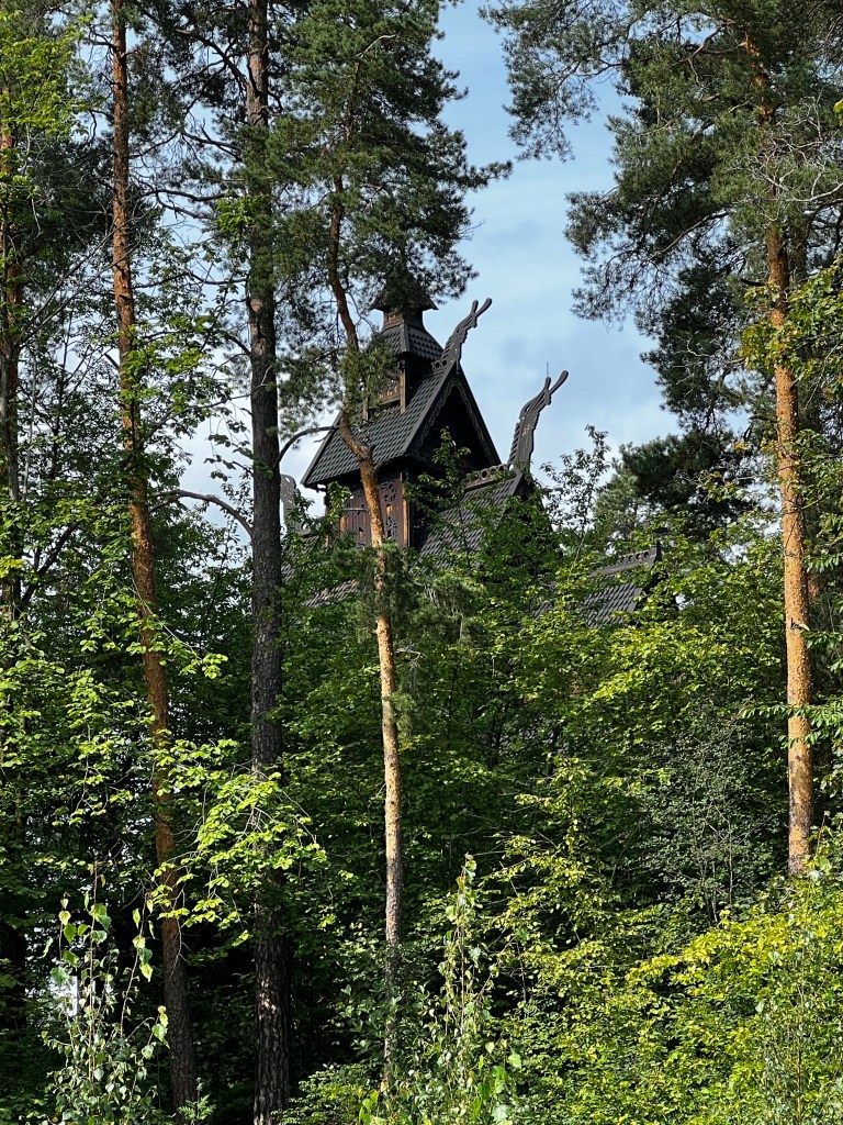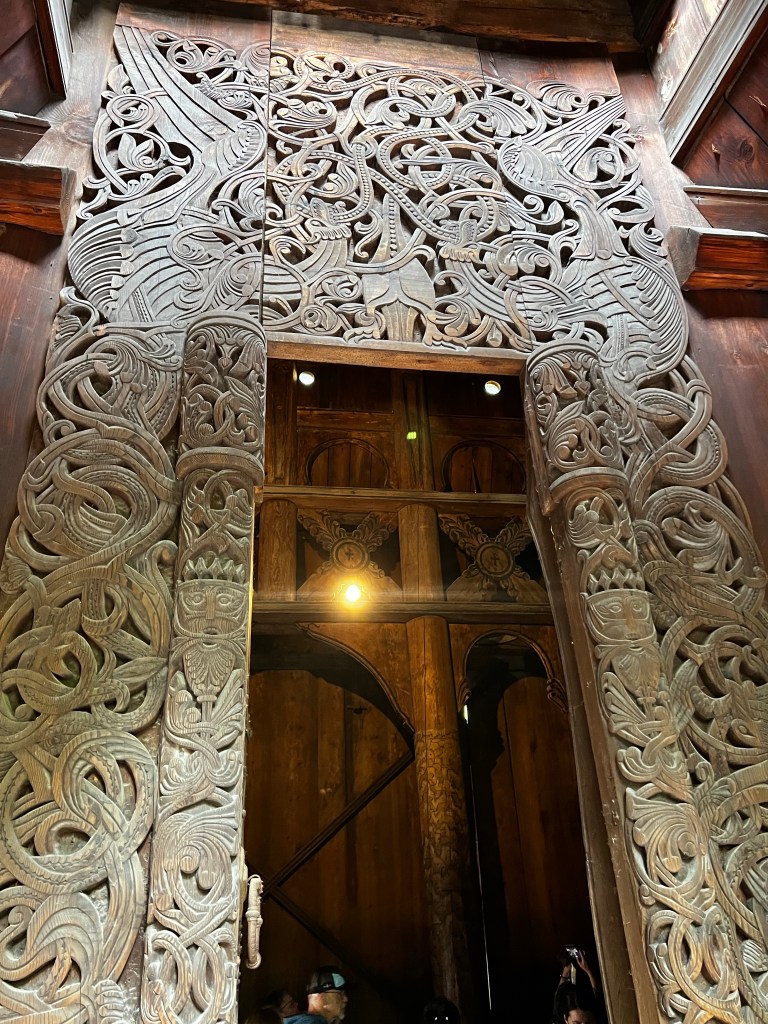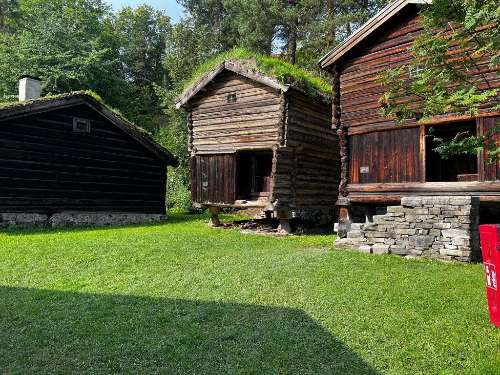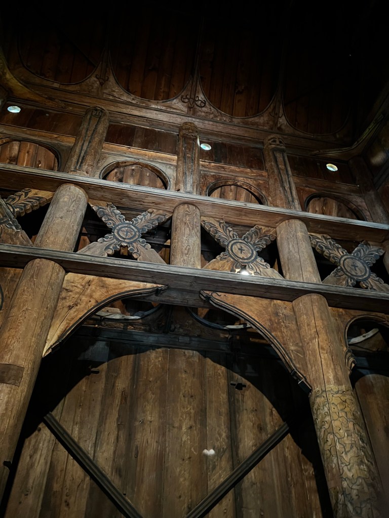 This was a great day out and the weather was beautiful today; a ferry trip to the museum and a wander around this enlightening space. Founded in the 1890s it’s sim is to display Norwegian culture and heritage through buildings and objects. It is a little like our Weald Museum in Sussex and it contains buildings that have been rescued from different areas of Norway and rebuilt on this site. The earliest buildings are from the 1300s and give a real insight into the way of life which continued until the 19th century. An excellent guide gave us a wealth of historical information on agriculture and living conditions. The centrepiece was the Stave Church erected here in the 1880s. It is dated by dendrochronology ti about 1280 and is quite magnificent. The reconstruction here must have been very difficult at that time. The interior has been stripped back to its original state. A masterpiece of the carpenters art. Beautiful carvings and a surprising early mural.