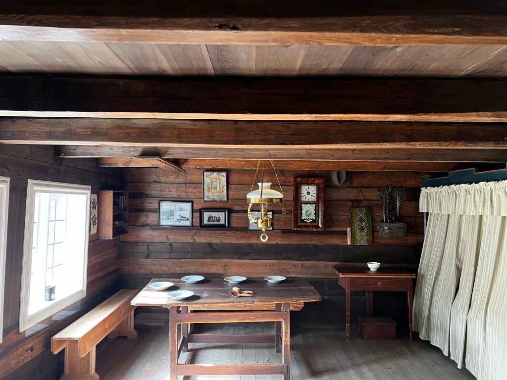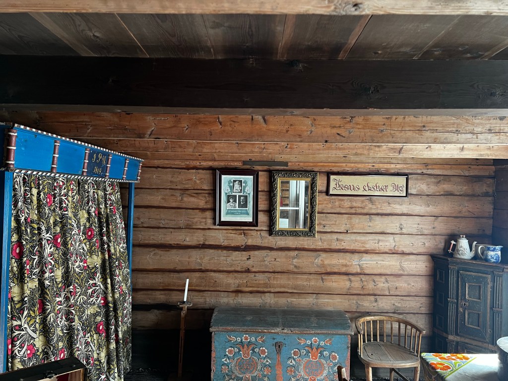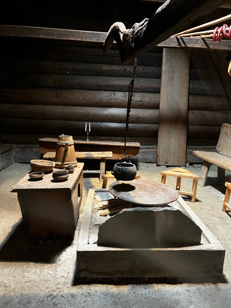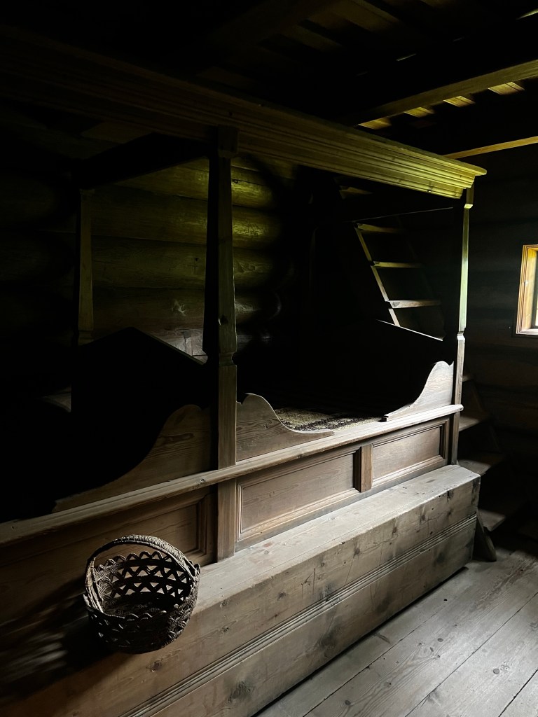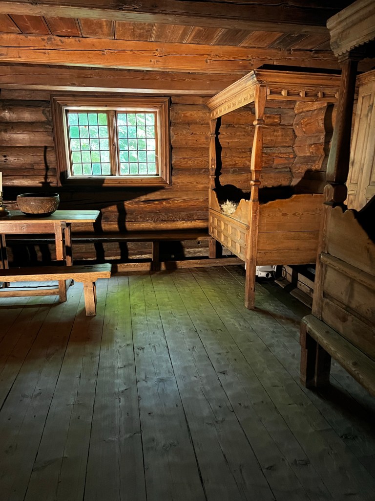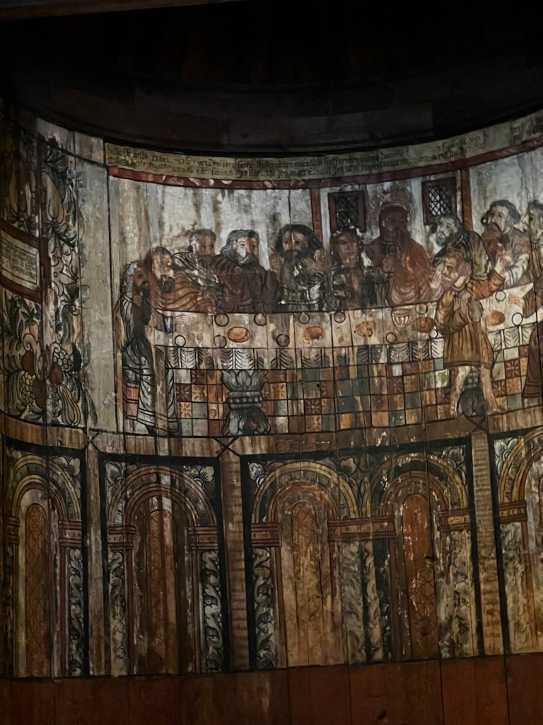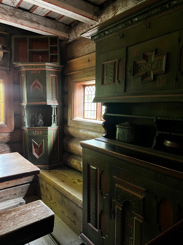 The museum contains buildings of all periods and includes interiors up to the present day. The interiors of the older farmhouses were fascinating. I loved the turf roofs too. the carvings were really beautiful. In general much of the carvings reminded me of 12th century sculpture in Herefordshire churches and the church mural was reminiscent of early English manuscripts.