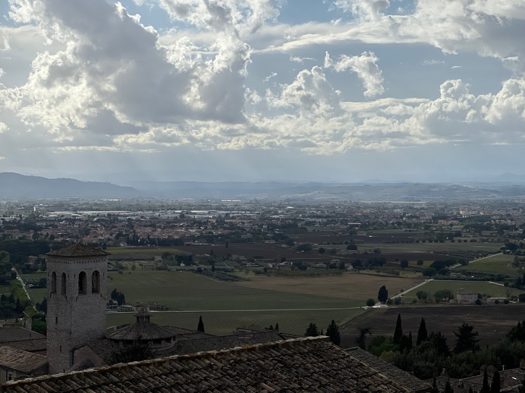 Assisi is rather beautiful perched on top of its hill. 3 miles from the station so you have to catch a bus into the city. Beautiful buildings newly restored after the two earthquakes of 1997 and 2016. The basilica is beautiful decorated with frescos by Giotto and Cimabue. the town itself is really hilly but it has some good buildings and wonderful views over Umbria. It’s a little quiet and rather strange. But I enjoyed my visit and the sun shone unlike yesterday in Florence with thunder, pouring rain and lightening. This weekend they had a lot of concerts celebrating the 800th anniversary of the death of St Francis. Obviously it’s a site of pilgrimage for many Catholics.