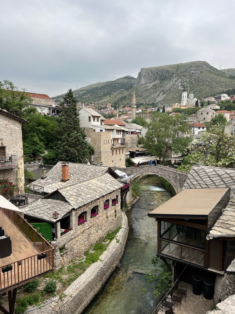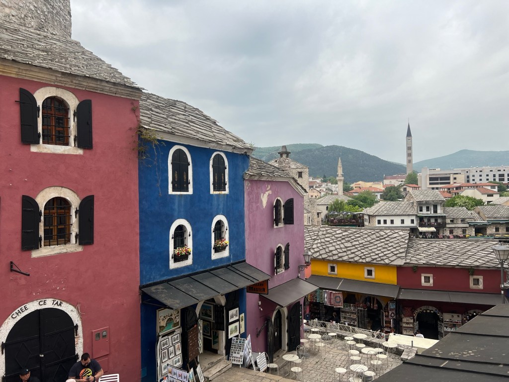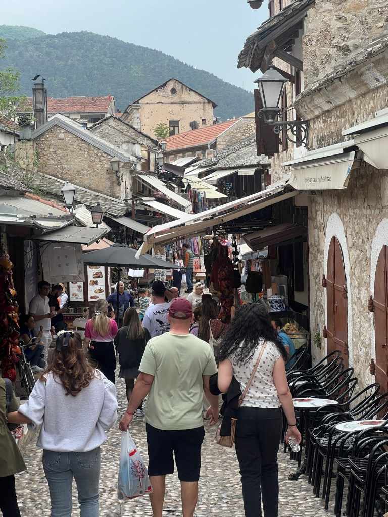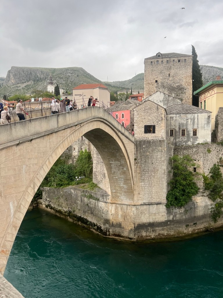 Today the three of us took a walk around the old town. Despite the depredations of the war it is being lovingly restored. The famous bridge, wantonly destroyed in 1993 by the Croatians is back to its former glory. firstly we visited the Museum of Genocide. One can’t say it was enjoyable but it was absorbing, disturbing informative and harrowing. It was well curated and the story it told should be a lesson in inhumanity and courage.