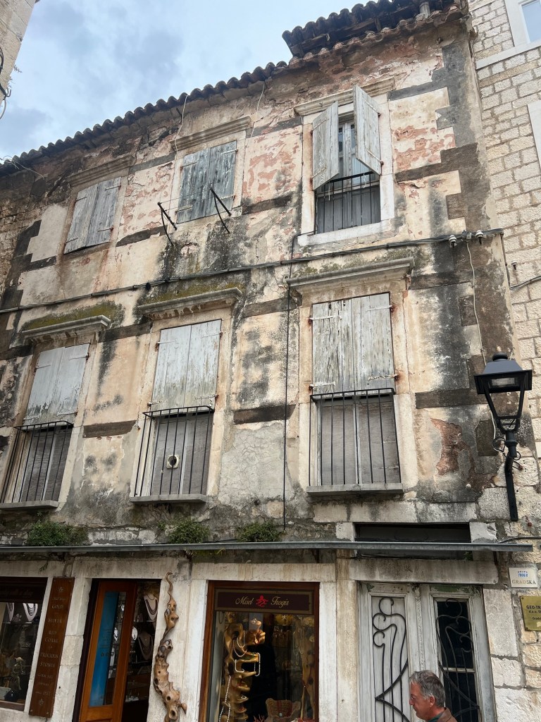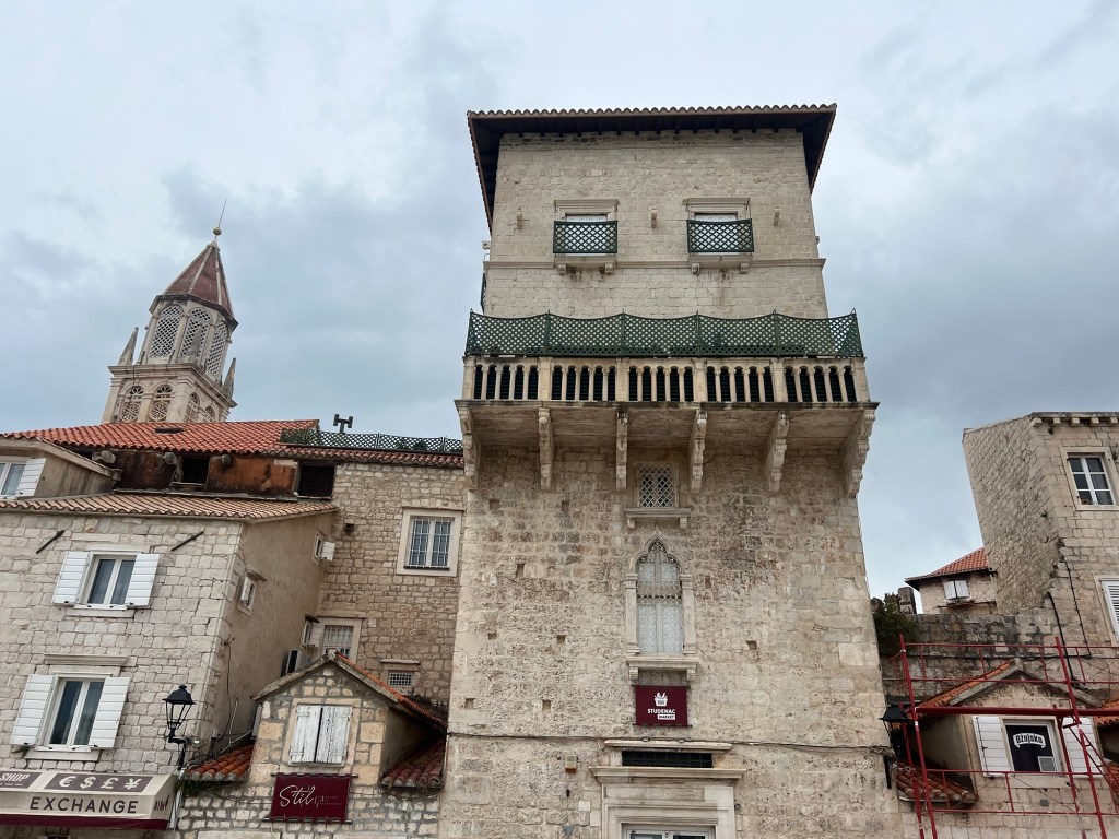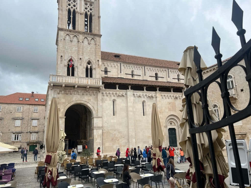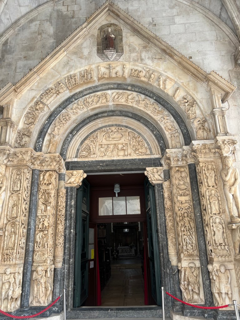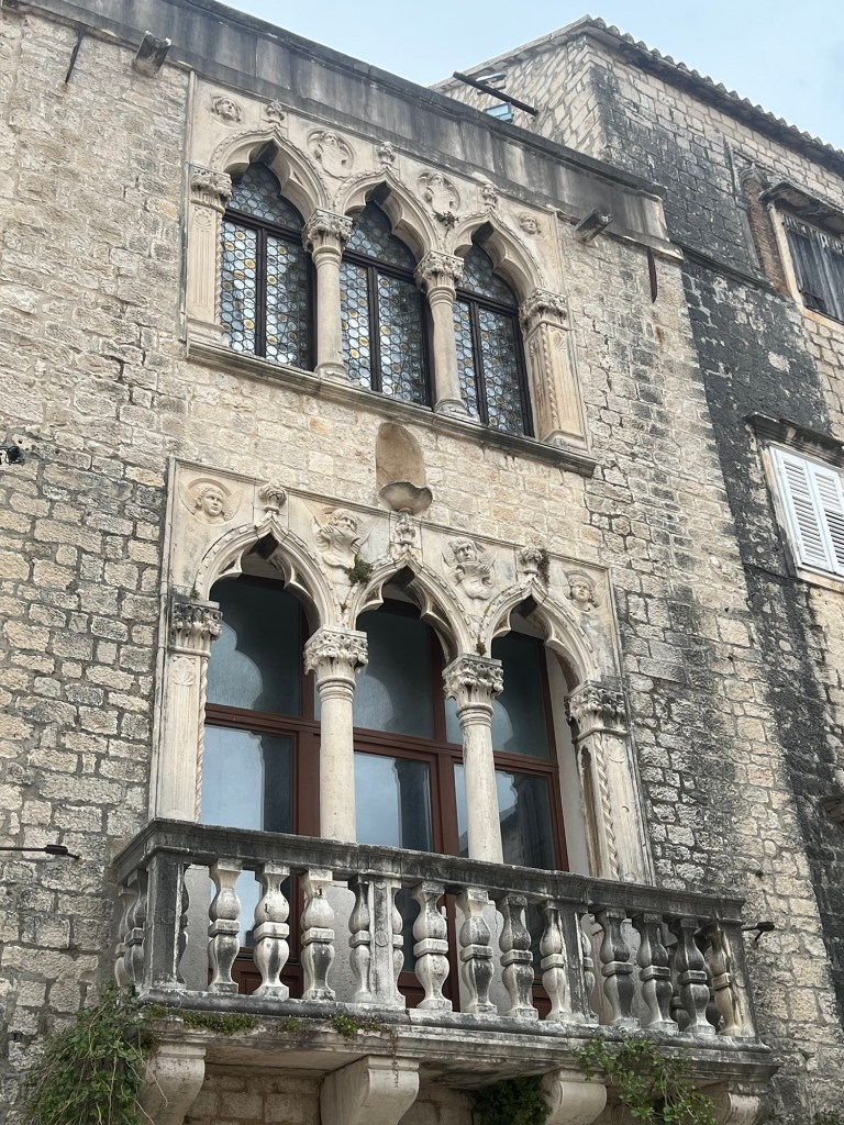 A charming small walled town on the Dalmatian coast. Quiet today. Founded by the Greeks and as usual here later colonised by Rome, Venice and the Ottomans. It had a maze of back streets and a wonderful Romanesque/ Gothic cathedral and tower and various spectacular Venetian gothic style architecture. It was really worth the visit.