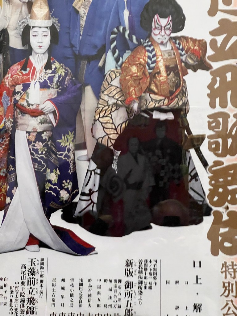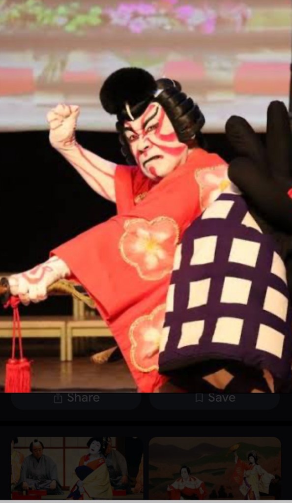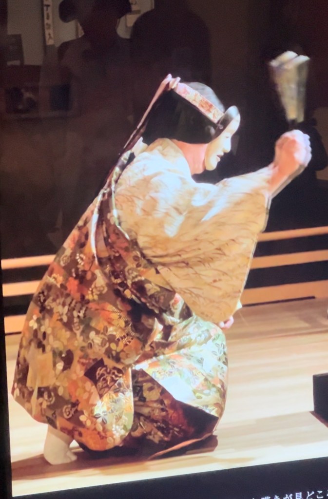 It’s a highly stylised form combining actors, narrator, musicians, dance and gesture. The voices of the characters are also very formalised with a distinctive declamatory intonation and the colours of costumes and make-up also point go character traits. At times the use of narrator, who also interacts with the cast, is almost Greek. Old stories often explain to a knowing audience other complexities of the plot. A wonderfully stimulating and sophisticated feast of colour, sound and texture with ritualised dance and movement. I saw a tragedy about exiled lovers, a dance celebrating autumn and a broad comedy. All sumptuous. The closed caption was excellent so I could follow the story even if the nuances were lost.