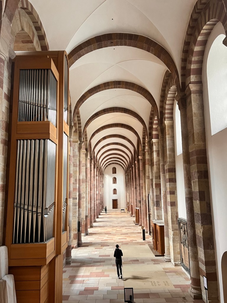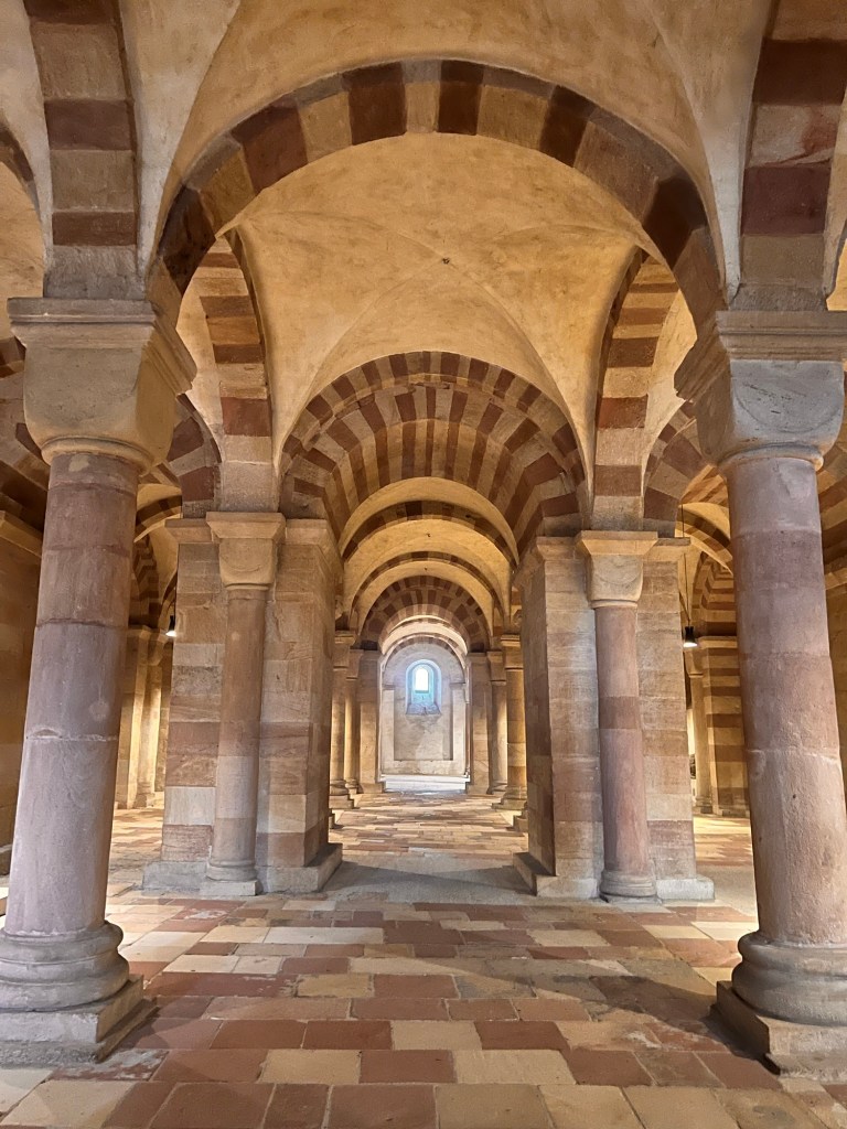 It’s a UNESCO World Heritage site for its seminal influence on Western European Romanesque architecture. Grand and with a feeling of immensity it has great dignity with its massive columns and barrel vault. The crypt with its tombs of early Holy Roman emperors was the first to be constructed and completed in 1041. It is a solemn and beautiful space with a groin vault and vistas along colonnades of massive piers. While I was in the Cathedral the organist played sonorous music which suited the majestic setting. It was wonderful to sit and contemplate for a while to his accompaniment.