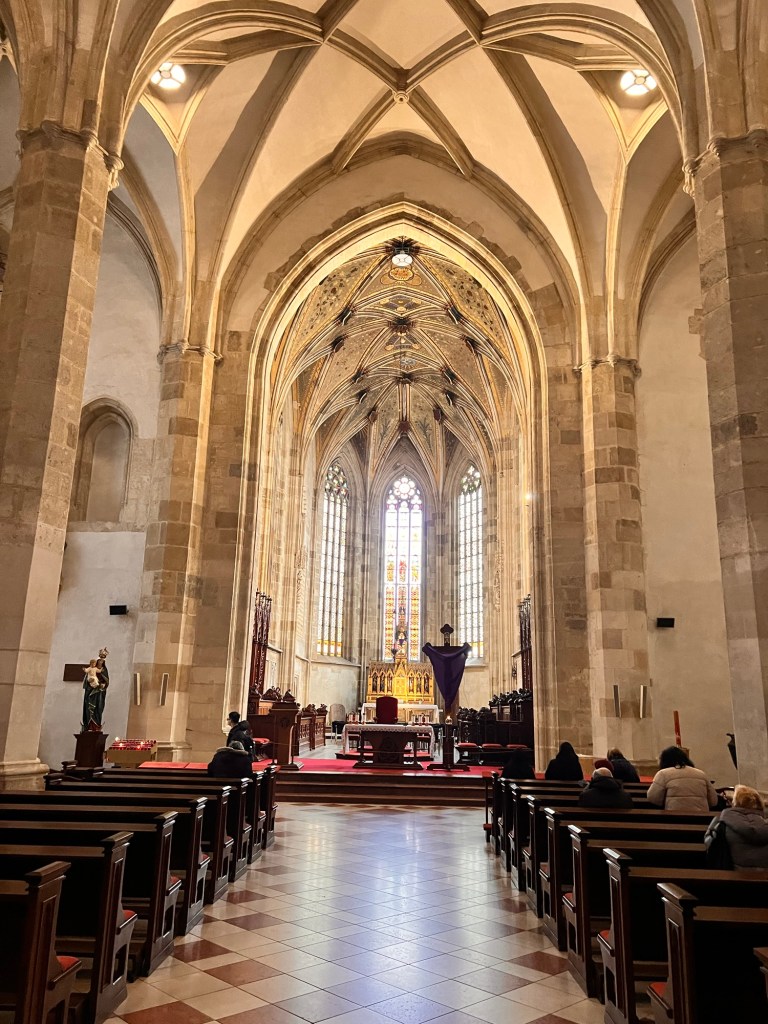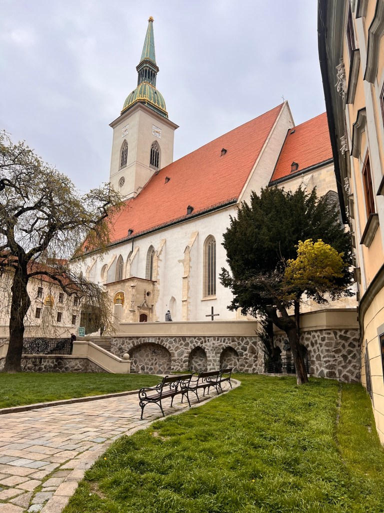 A slightly warmer day … a tour around the old town with an excellent guide. It is quiet after Prague; lots of English tourists in almost empty streets. Our guide was very informative on the development of Bratislava particularly the 18th and nineteenth centuries and the role of Austria and Hungary in the creation of the town and the state. The Cathedral was the coronation place of Holy Roman Emperors until 1830 … a sort of Westminster Abbey. The architecture is predominantly Baroque and nineteenth century and classical in style. Bratislava, being in the centre of the Austro-Hungarian Empire has seen a variety if ethnic groups dominating the city by turns German, Hungarian and Slovak. It’s only in the last hundred or so years that Slovaks have become the dominant group. This history of Central Europe is endlessly fascinating … the rise and fall and subjugation of peoples by their neighbours; Bratislava was even occupied by Ottoman Turks in the sixteenth century.