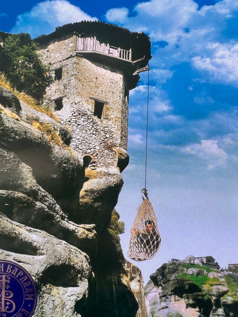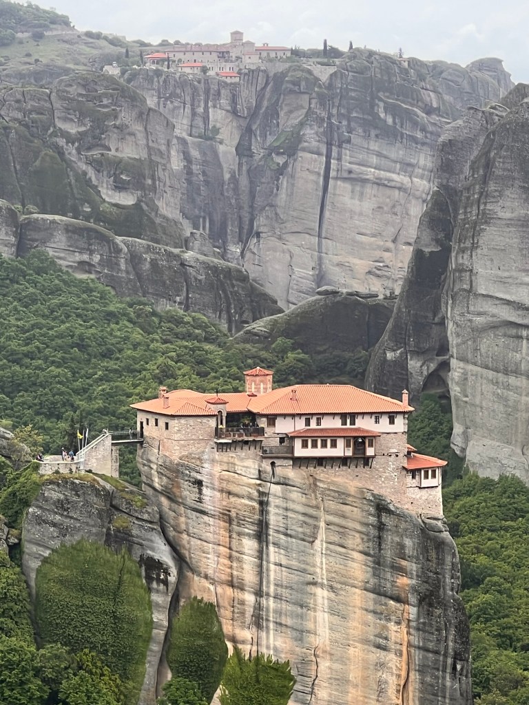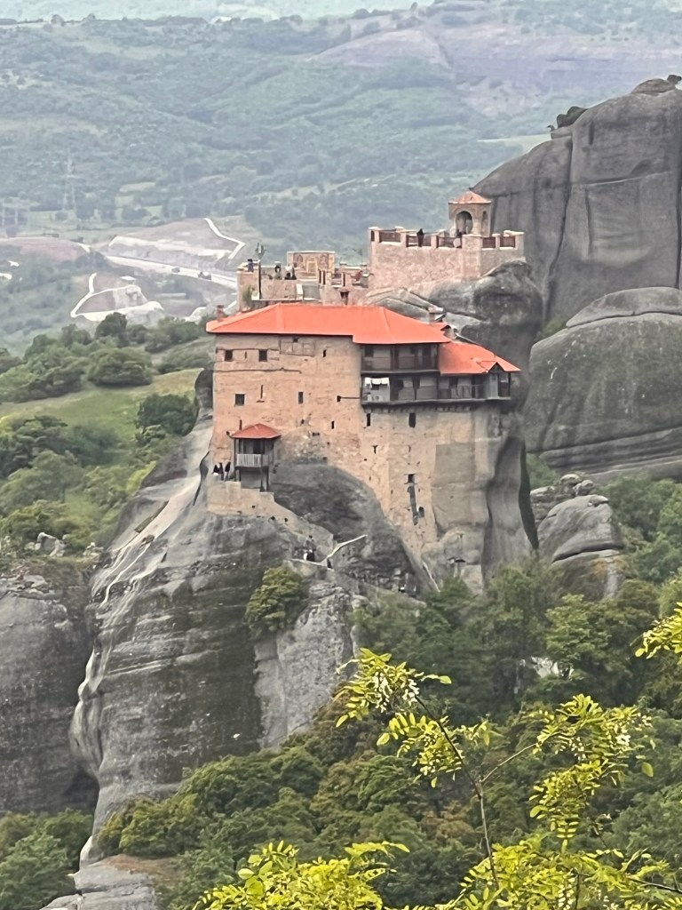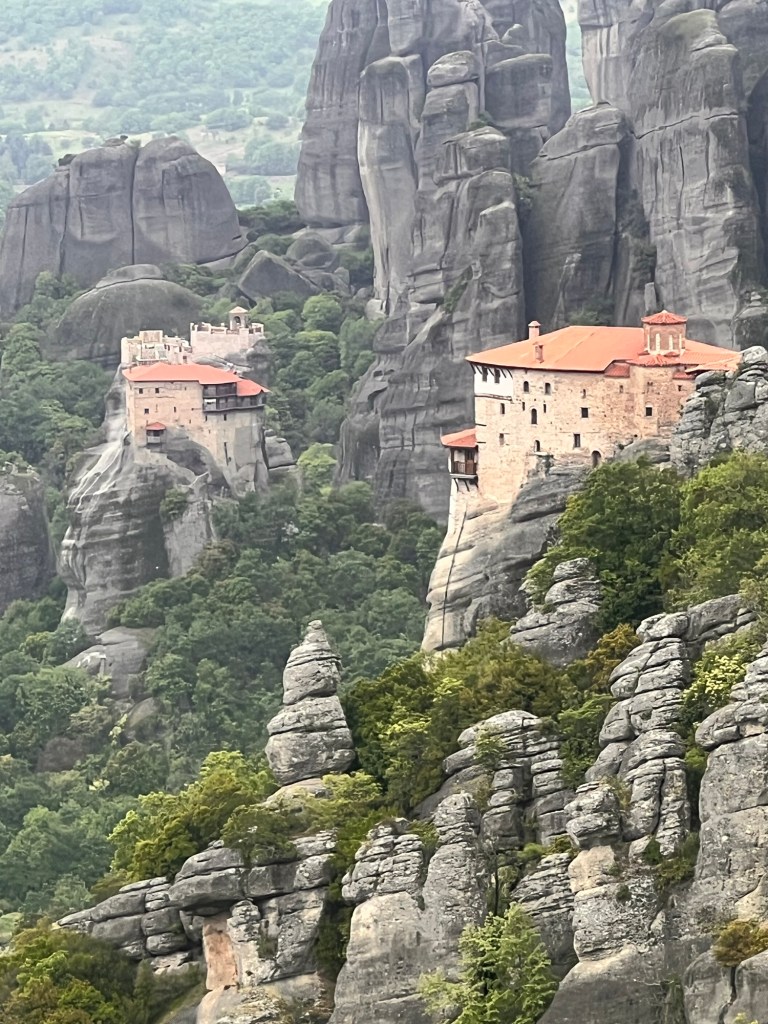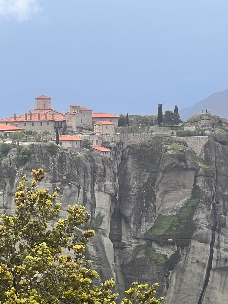 Today was something I will never forget. These photos will not do Meteora justice. A three hour drive took us past a snow-capped Mount Olympus to Meteora in Central Greece. Home to 24 monasteries built on vertiginous precipices in the remote region of Meteora. In greek it means “between the earth and the sky”. Isolated for both protection and contemplation these places are both works of art and of human ingenuity. The landscape is indescribably beautiful with monasteries perched high above the valleys. Six monasteries are open and we visited two (Roussanou and Varlaam) but saw five from a glorious viewpoint. The frescoes and architecture are vibrant and cover the walls as do icons and treasures. The access was up dizzying steps and bridges slung across yawning chasms. In the medieval period people, animals and all necessaries were winched up 500 feet in nets.