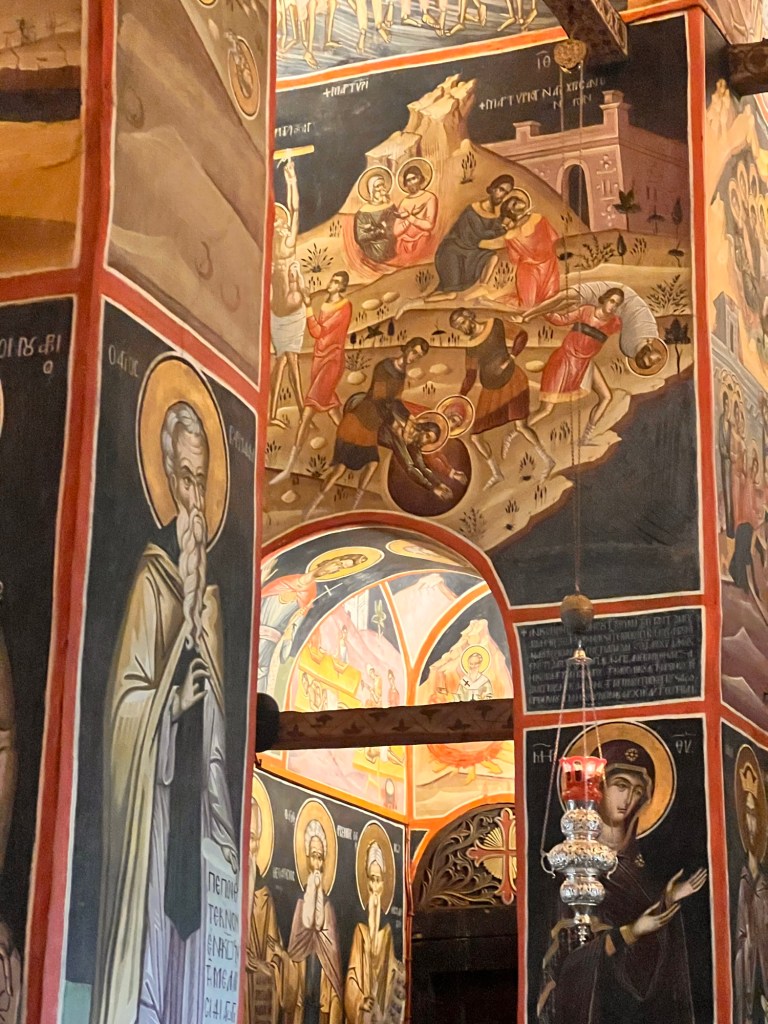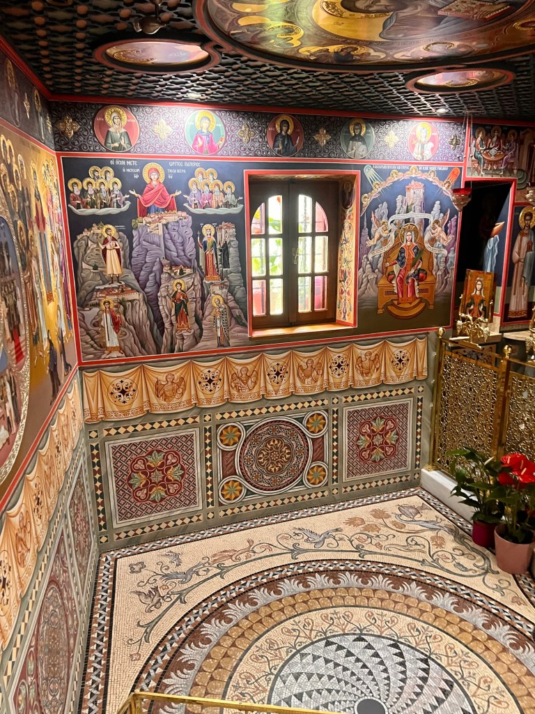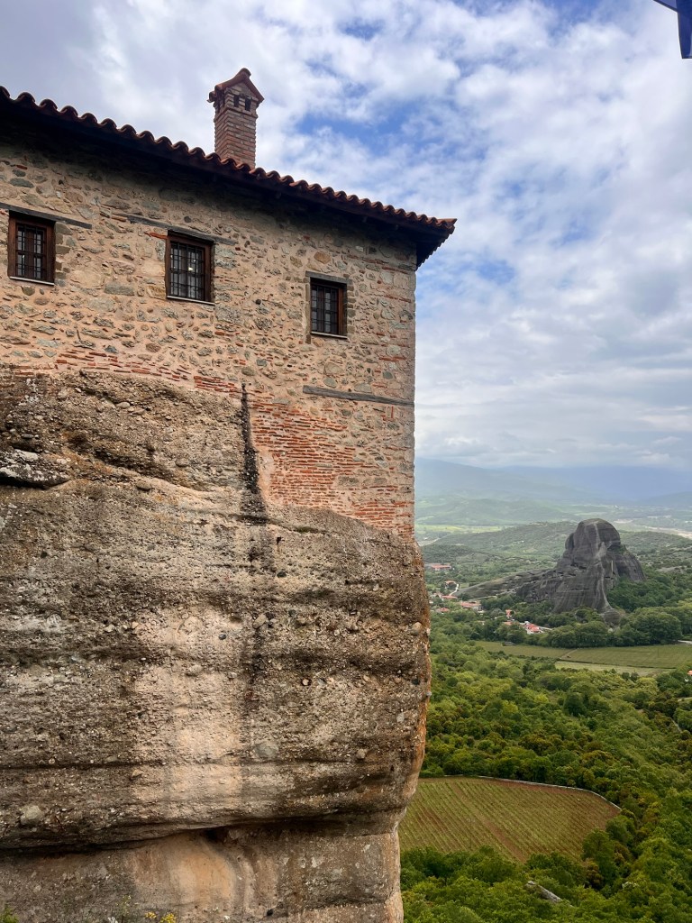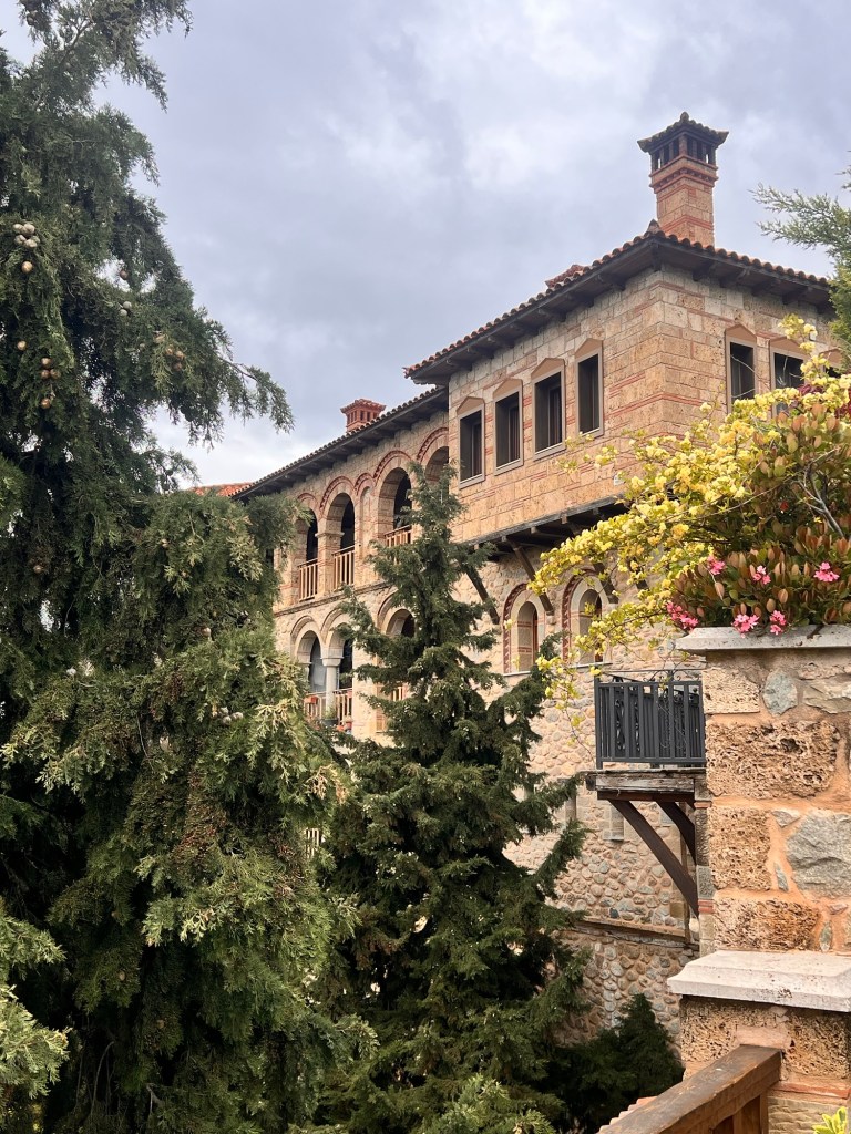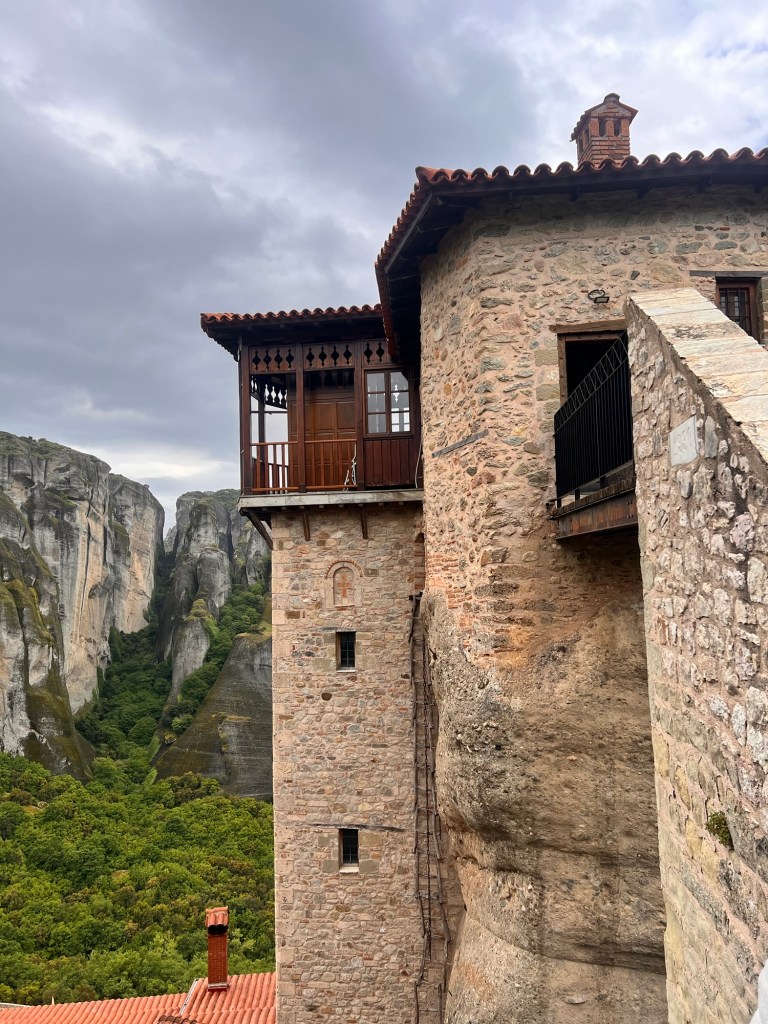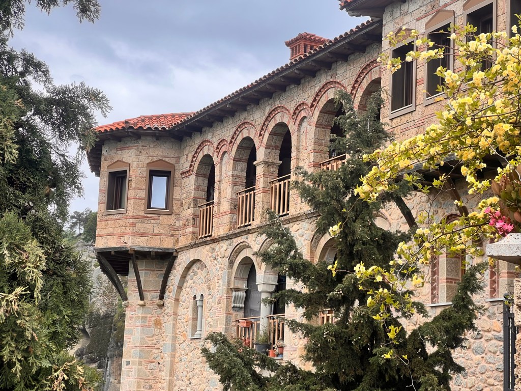 Today was something I will never forget. These photos will not do Meteora justice. A three hour drive took us past a snow-capped Mount Olympus to Meteora in Central Greece. Home to 24 monasteries built on vertiginous precipices in the remote region of Meteora. In greek it means “between the earth and the sky”. Isolated for both protection and contemplation these places are both works of art and of human ingenuity. The landscape is indescribably beautiful with monasteries perched high above the valleys. Six monasteries are open and we visited two (Roussanou and Varlaam) but saw five from a glorious viewpoint. The frescoes and architecture are vibrant and cover the walls as do icons and treasures. The access was up dizzying steps and bridges slung across yawning chasms. In the medieval period people, animals and all necessaries were winched up 500 feet in nets.