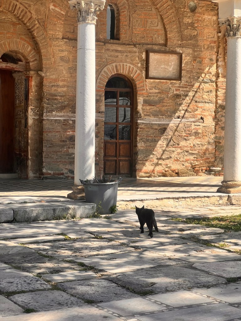 It’s still and quiet here in the monastery courtyard. A dog barks, swallows wheel above; peacocks scream and doves murmur; a cat passes. time to reflect, contemplate and meditate. Now to make my way North and home.