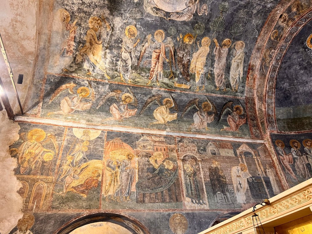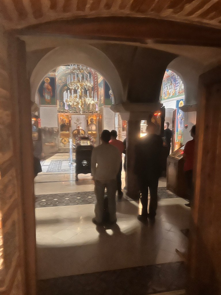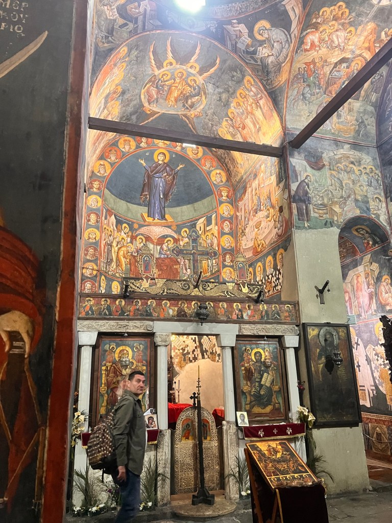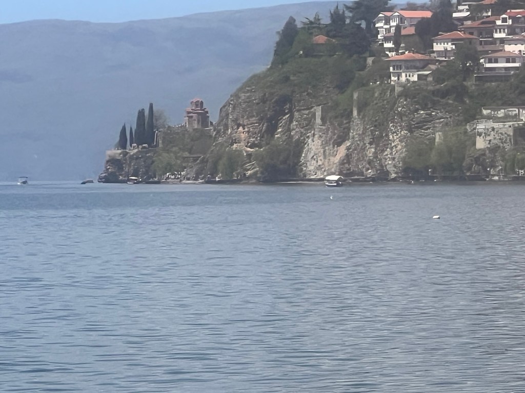 I walked up into the hills behind the town to explore the interiors of some of the churches which were closed yesterday but which contained treasures of Byzantine art. I sat outside St Clement’s church which has breathtaking views of lake Ohrid looking towards Albania. Lizards climbed the walls to find warmth, birds sang and morning mist arose from the water. Inside the priest intoned mass.
