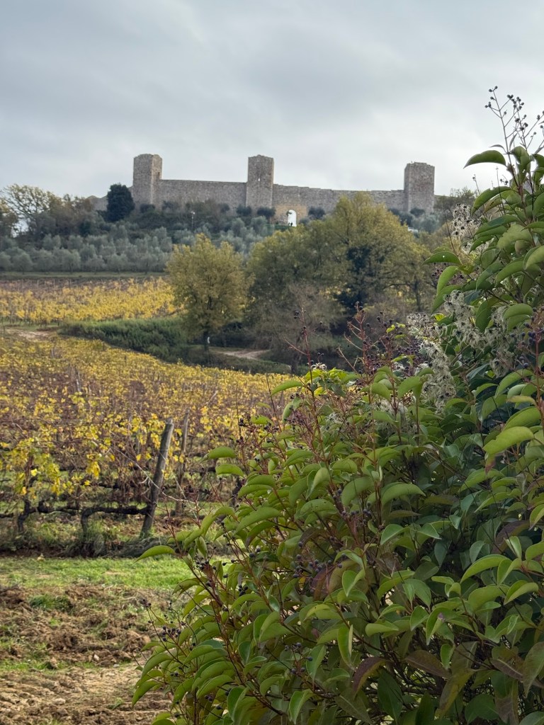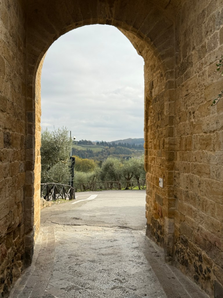 Today I took a bus ride through the lovely Tuscan countryside to this perfect little hilltop town. Set amidst olive groves, vineyards and rolling green hills it is difficult to describe its qualities. The walls were constructed in the 1220s and the town was a defensive stronghold for the Republic of Siena against its perpetual enemy, Florence. Made more famous by its inclusion in Dante’s Divine Comedy it is on the Italian equivalent of the Camino … the Via Francigena on the pilgrimage route from Canterbury to Rome. The views are amazing from this little town. It is tiny but charming with a church and a town square and a couple of little back streets through which the pilgrimage route runs. It has a museum of arms and you can walk the walls. You enter through one of two gate; one from Florence and one from Rome.